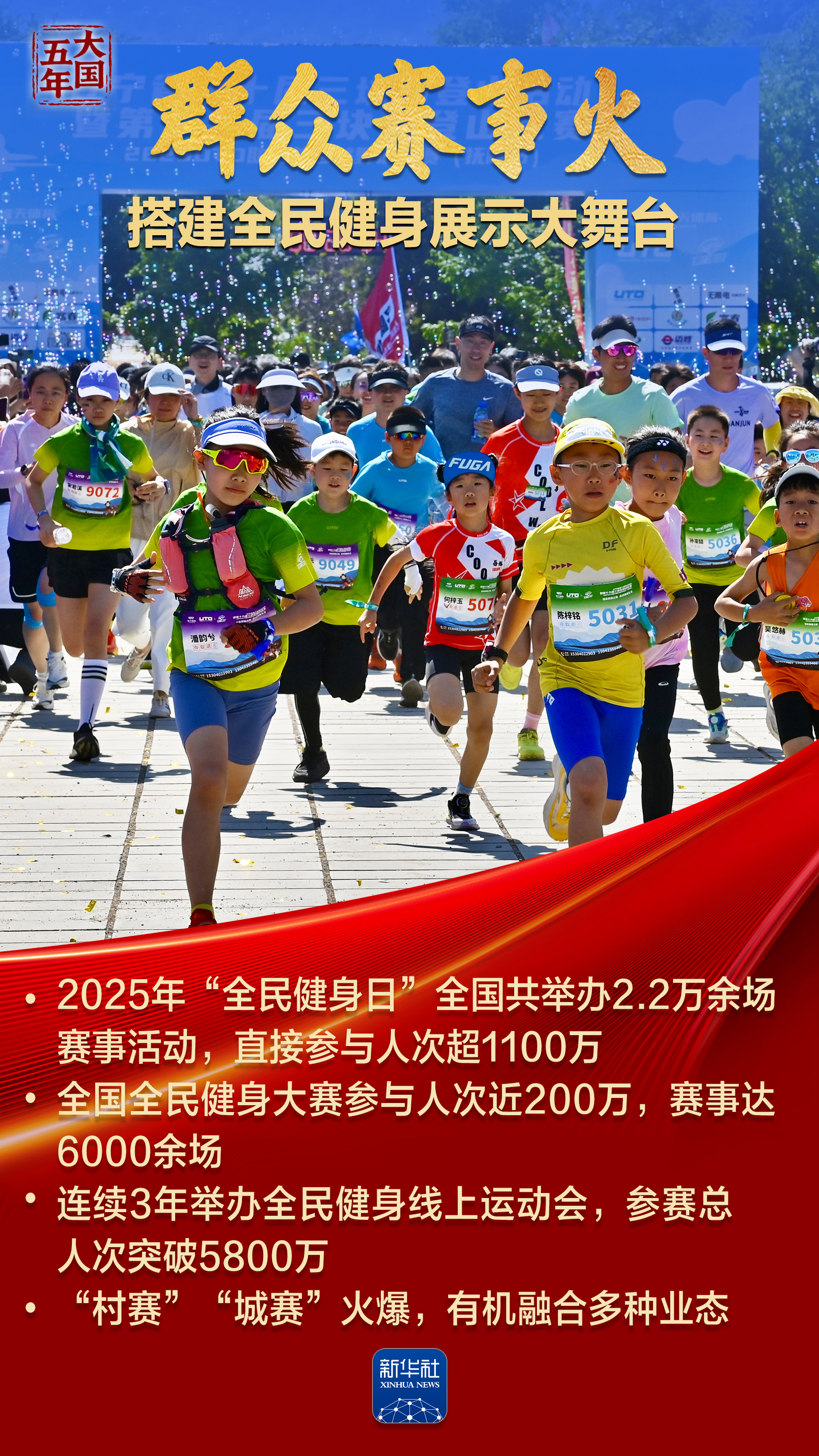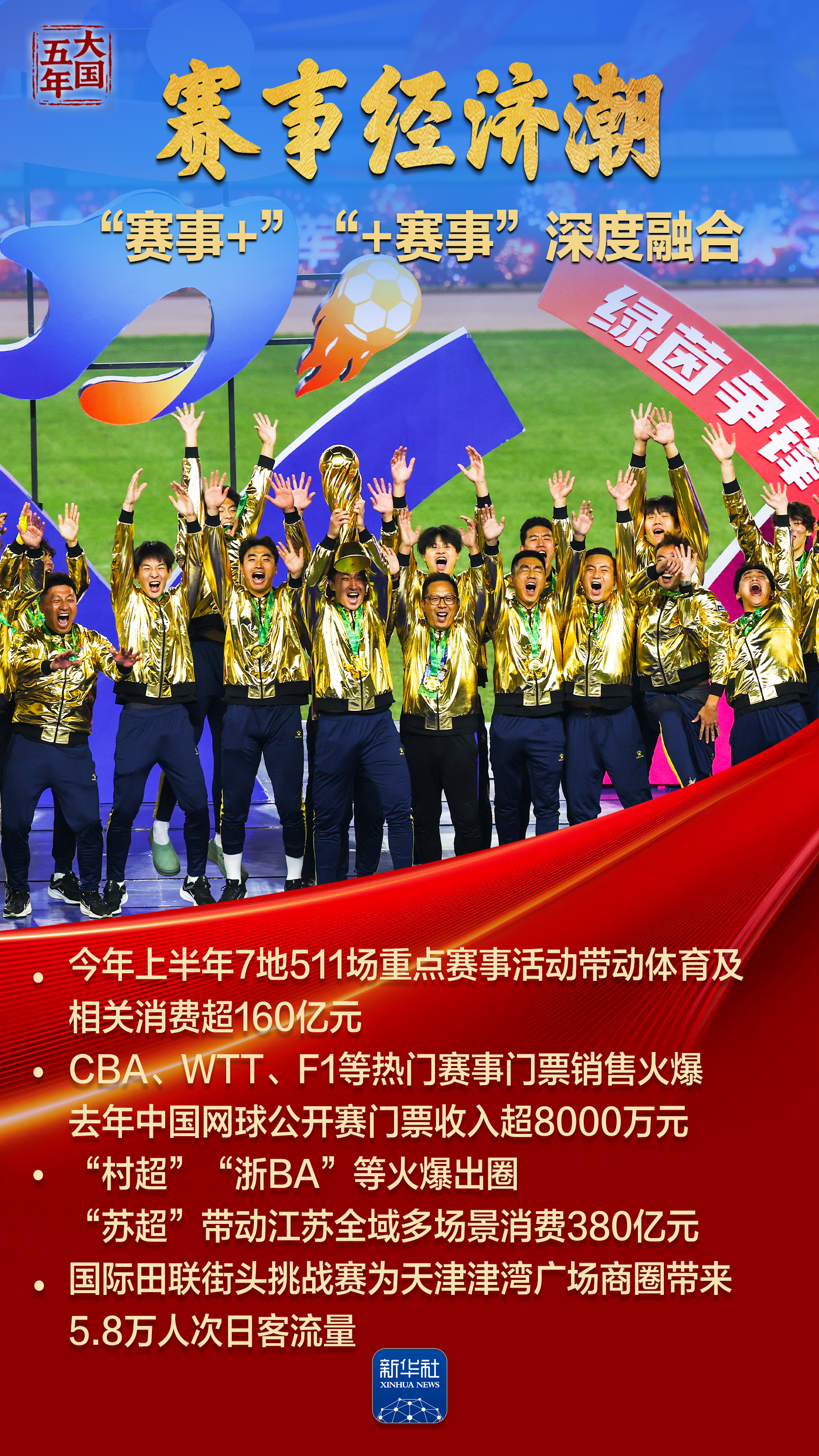 竞技场上,国旗频升国歌频传盛多网,体育健儿写下“体育大国”“奥运强国”最精彩篇章;公园里巷,全民健身,“轻体育”生活成为“健康中国”新风尚;“村超”“苏超”好戏连台、热火朝天,普通人成为新主角;新业态、新消费迸发无限活力,体育经济亿万规模助力国民经济……