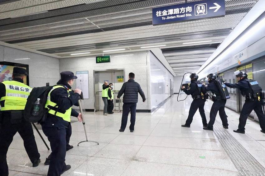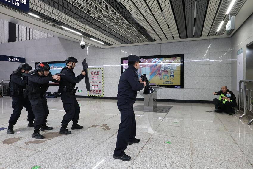 站台上,地铁工作人员熟练设置隔离带,疏散围观乘客,维持现场秩序。轨道、特警警力与“歹徒”展开对峙,进行法治宣讲,找准时机准备实施抓捕。